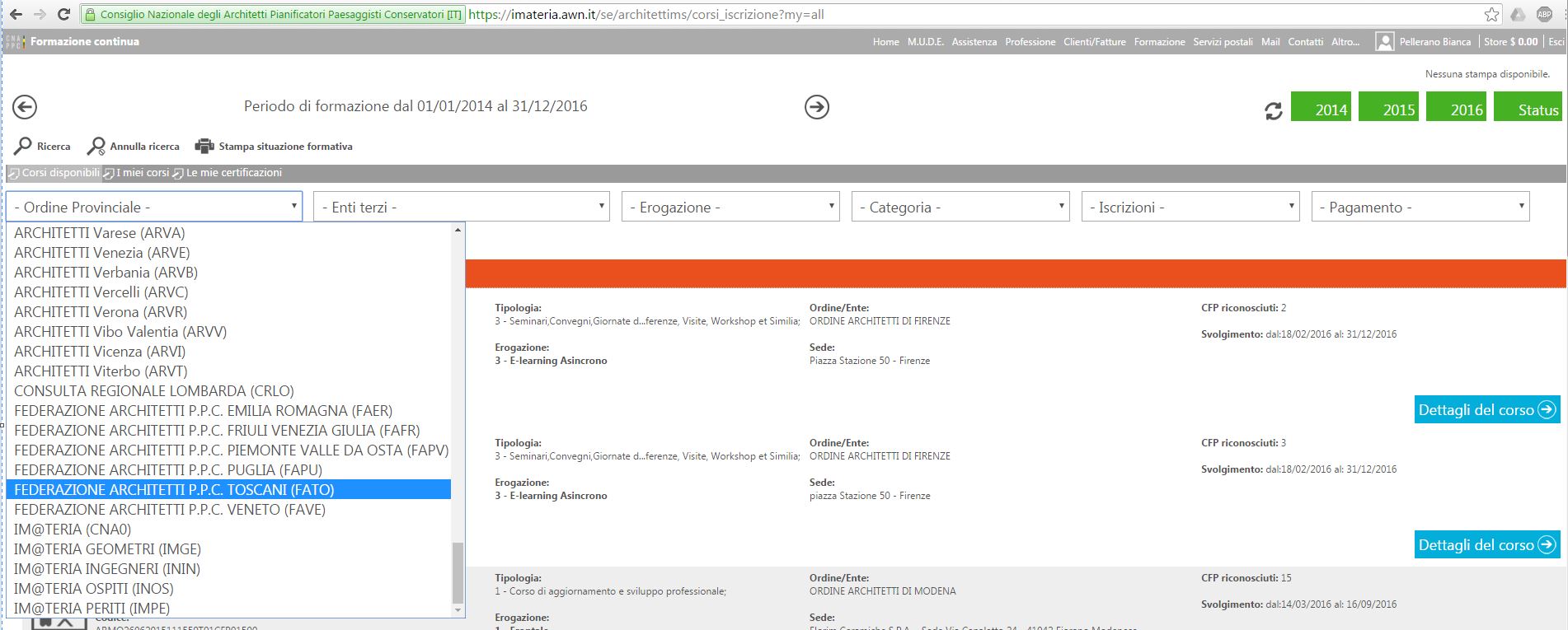 L’evento appare tra i corsi disponibili filtrando: ordine provinciale = ” FEDERAZIONE ARCHITETTI PPC TOSCANI (FATO)” (vedi istruzioni)